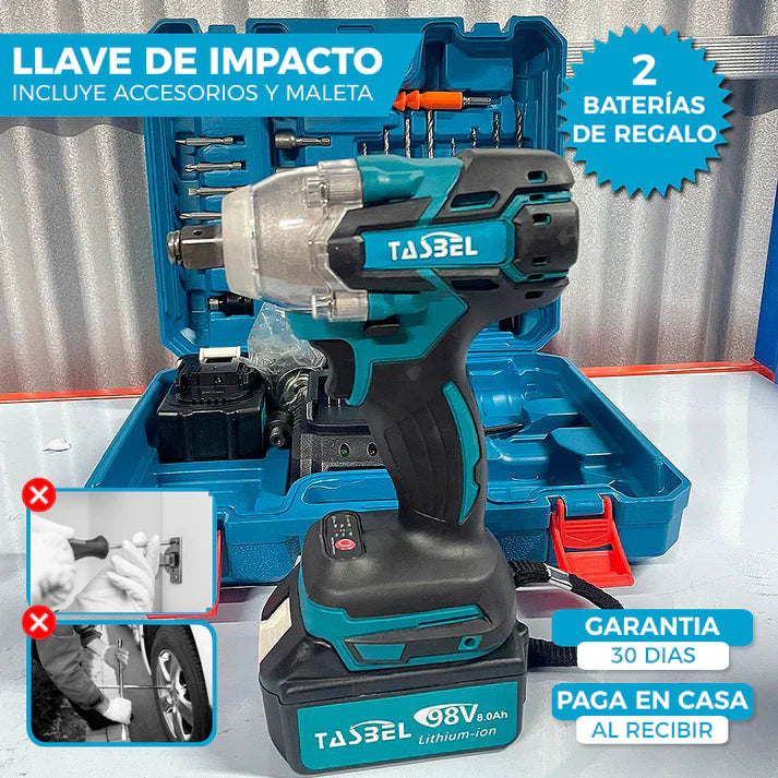 La Llave de Impacto con Adaptador a Taladro incluye 2 Baterías de 98V para nunca quedarte sin batería ni potencia 🦾